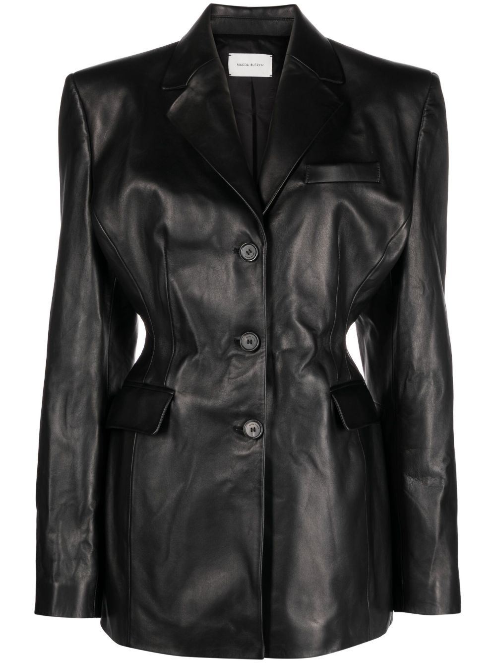 single-breasted leather jacket Crafted from supple leather, Madga Butrym’s jacket mirrors '80s tailoring – note the nipped-in waist and structured shoulders. It’s finished with an adjustable belt at the back for a custom fit. Highlights - Black - Sheepskin - Notched collar - V-neck - Fitted waistline - Long sleeves - Chest welt pocket - Two front flap pockets - Rear belt - Straight hem Imported Composition Outer: Sheepskin 100% Lining: Viscose 100% SIZE & FIT Model measurements Height 5 ft 10 in(1.77 m) Bust/Chest 27.95 in(71 cm) Hips 33.85 in(86 cm) Waist 23.22 in(59 cm) FittingInformation Designed for a slim fit that sits just away from the body offering a close yet comfortable fit The tie fastening gives an adaptable and personalised fit Soft leather has a supple and smooth construction offering some flexibility This piece fits true to size – take your usual size