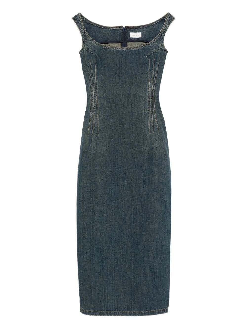 square-neck denim dress Highlights - Blue - Denim - Sleeveless - Square neckline - Fitted bodice - Concealed zip fastening Imported Composition Cotton 100% SIZE & FIT Model measurements Height 5 ft 10 in(1.78 m) Bust/Chest 33.46 in(85 cm) Hips 36.22 in(92 cm) Waist 23.22 in(59 cm) Washing instructions Machine Wash