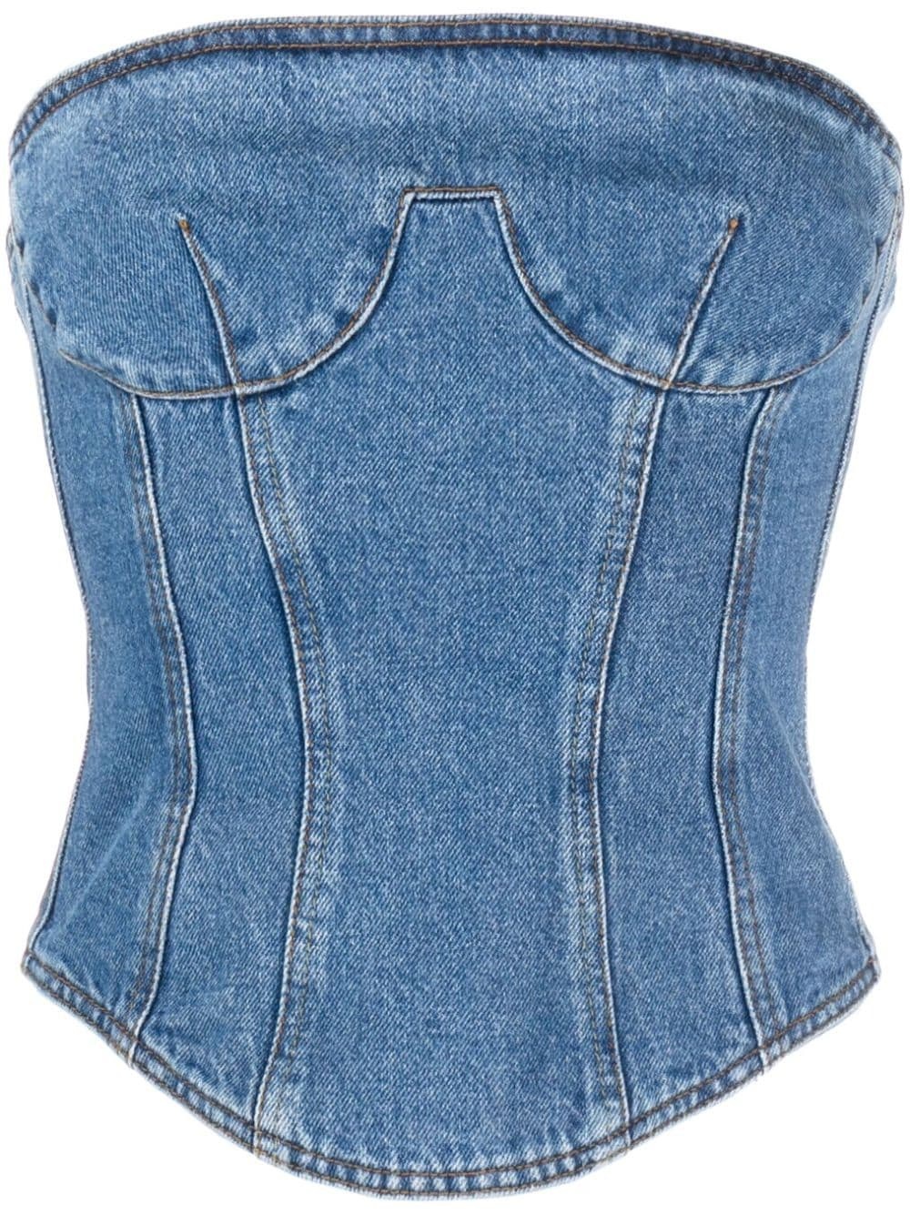 strapless denim corset top Magda Butrym's denim strapless top offers a contemporary update on classic corsets. It cinches in slightly at the waist to mimic an hourglass silhouette and has a curved hem. Unlike traditional designs, it features an elasticated shirred panel at the rear for an unrestricted fit. Highlights - Light blue - Cotton - Denim - Shirred panel - Strapless - Rear zip fastening - Curved hem Imported Composition Outer: Cotton 100% SIZE & FIT Model measurements Height 5 ft 10 in(1.77 m) Bust/Chest 27.95 in(71 cm) Hips 33.85 in(86 cm) Waist 23.22 in(59 cm) FittingInformation Designed for a close fit throughout Made from a midweight non-stretch fabric This piece fits true to size – take your usual size