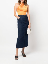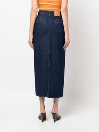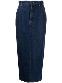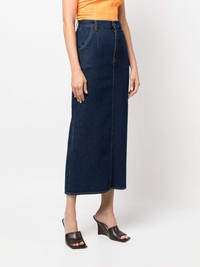 Tima denim midi skirt blue cotton logo patch to the rear contrast stitching belt loops front button and zip fastening slip pockets to the sides two rear welt pockets rear slit straight hem long length Imported Composition Cotton 100% SIZE & FIT Model measurements Height 5 ft 9 in(1.75 m) Bust/Chest 32.67 in(83 cm) Hips 36.22 in(92 cm) Waist 24.8 in(63 cm) Measurement HIPS 35.82 in(91 cm) LENGTH 35.82 in(91 cm) WAIST 25.19 in(64 cm) FittingInformation This piece fits true to size. We recommend you get your regular size Cut for a slim fit Made with a mid-weight non-stretch fabric Washing instructions Dry Clean Only