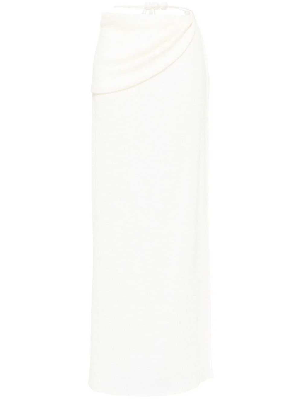 wraparound maxi skirt Highlights - Cream white - Wraparound style - Faux-pearl detailing - Floor-length - Fluid Imported Composition Lyocell 59%, Polyester 40%, Elastane 1% SIZE & FIT Model measurements Height 5 ft 9 in(1.76 m) Bust/Chest 31.1 in(79 cm) Hips 35.03 in(89 cm) Waist 24.4 in(62 cm) FittingInformation This maxi-length skirt is intended to be worn low on the hips The elasticated waist allows for a comfortable fit Made from a lightweight stretch fabric, this piece offers elasticity and flexibility when worn This piece fits true to size – take your usual size Washing instructions Dry Clean Only