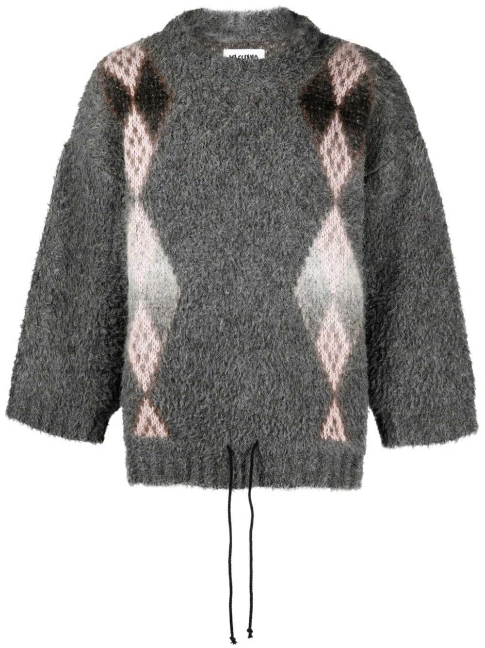 brushed-effect knitted drawstring jumper Highlights - Dark grey/multicolour - Knitted construction - Patterned intarsia knit - Brushed effect - Crew neck - Drop shoulder - Three-quarter length sleeves - Ribbed cuffs and hem - Drawstring hem - When buying this unisex item, keep in mind that it is graded in standard men's sizing. Made in Italy Composition Wool 40%, Mohair 26%, Alpaca 20%, Polyamide 14% SIZE & FIT Model measurements Height 6 ft 2 in(1.89 m) Bust/Chest 38.97 in(99 cm) Hips 38.18 in(97 cm) Waist 32.28 in(82 cm) FittingInformation This unisex piece is designed for a loose fit whether you usually select women's or men's sizes Made with a midweight knit, this piece offers some stretch Washing instructions Dry Clean Only