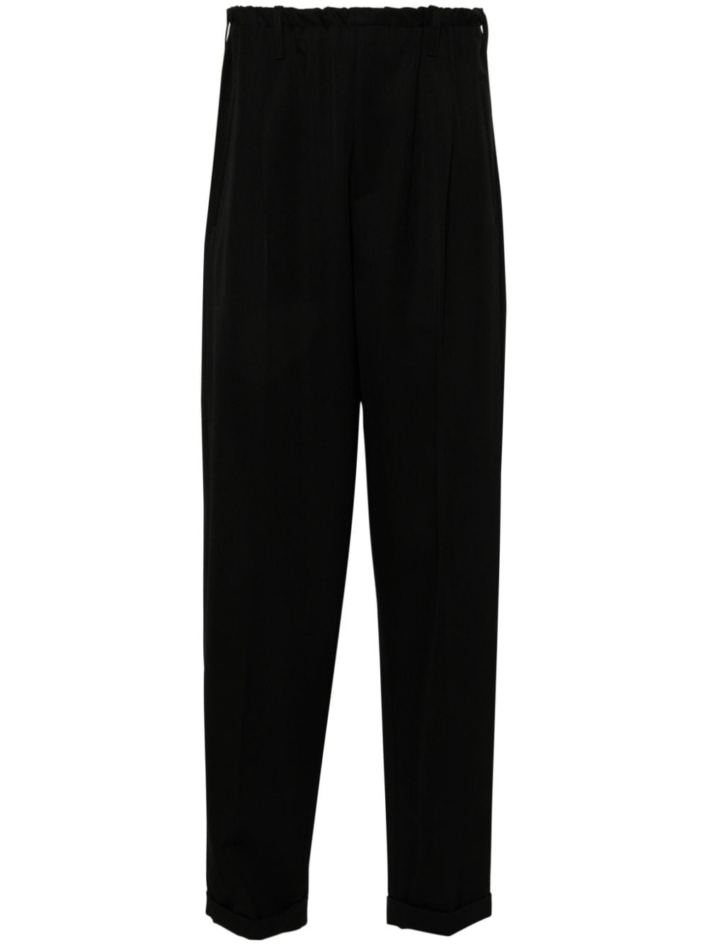 People's trousers Highlights - Black - Virgin wool - Twill weave - Tailored design - Belt loops - Two side welt pockets - Front pleat detailing - Pressed crease - Full-length - Turn-up hem - Two rear welt pockets - Front concealed zip fly fastening - Elasticated waistband with internal drawstring Made in Italy Composition Outer: Virgin Wool 100% Lining: Cotton 100% SIZE & FIT Model measurements Height 6 ft 1 in(1.85 m) Bust/Chest 35.82 in(91 cm) Hips 37.79 in(96 cm) Waist 29.13 in(74 cm) FittingInformation Designed for a tapered leg, offering a loose unrestricted fit over the leg with a closer fit towards the ankle Adjust this piece’s waistband to your preference using the drawstring Made from a midweight non-stretch fabric This piece fits true to size – take your usual size