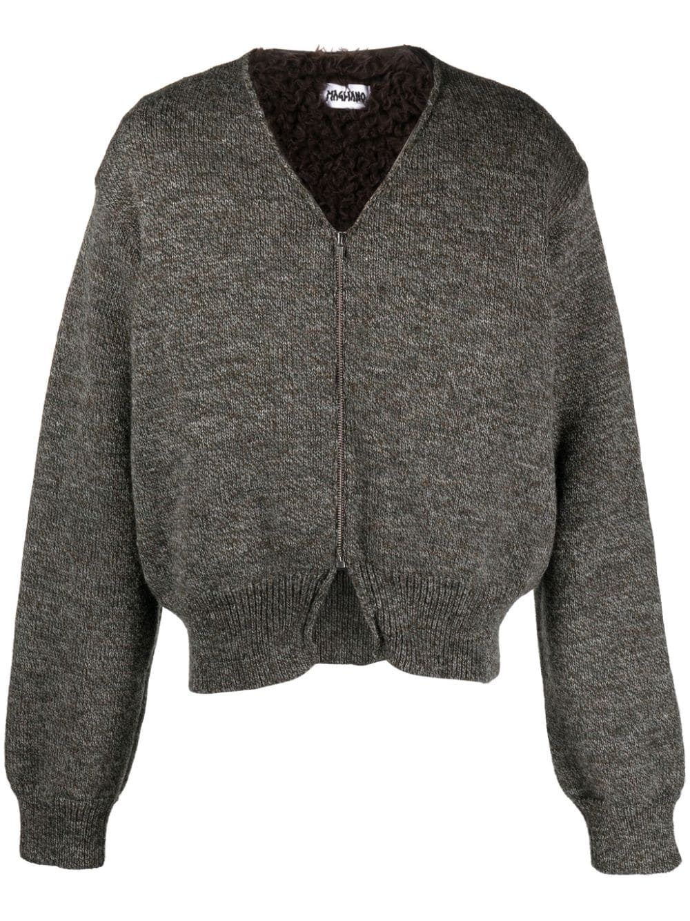 V-neck zip-up wool cardigan Highlights - Grey/multicolour - Wool - Knitted construction - Logo patch to the rear - Shearling lining - V-neck - Front zip fastening - Front slit - Drop shoulder - Long sleeves - Ribbed cuffs and hem - Straight hem Made in Italy Composition Wool 100%, Leather 100%, Acrylic 36%, Polyamide 33%, Mohair 29%, Spandex/Elastane 2% SIZE & FIT Model measurements Height 6 ft 2 in(1.88 m) Bust/Chest 36.61 in(93 cm) Hips 35.82 in(91 cm) Waist 27.95 in(71 cm) FittingInformation Designed to be unstructured, offering a loose fit throughout Made with a midweight knit, this piece offers some stretch This piece fits true to size – take your usual size