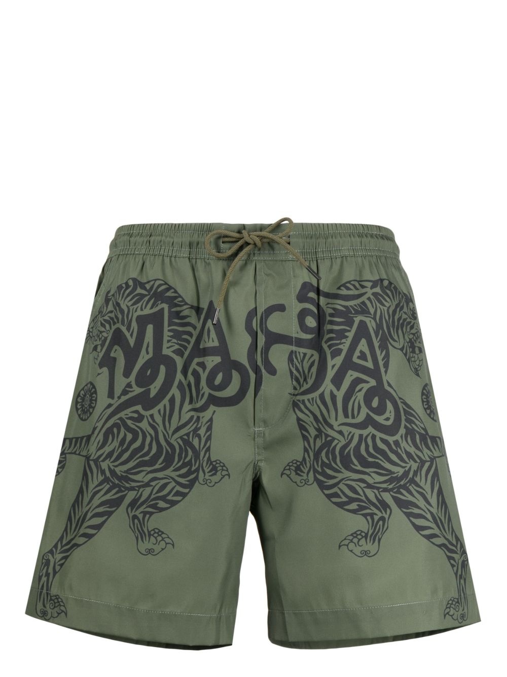 Maharishi Muay Thai swim shorts Highlights - Olive green/black - Recycled polyester - Tiger print - Elasticated drawstring waistband - Two side inset pockets - Rear flap pocket - Be mindful to try on swimwear over your own garments. Imported Composition Recycled Polyester 100% SIZE & FIT Measurement WAIST 30.7 in(78 cm)
