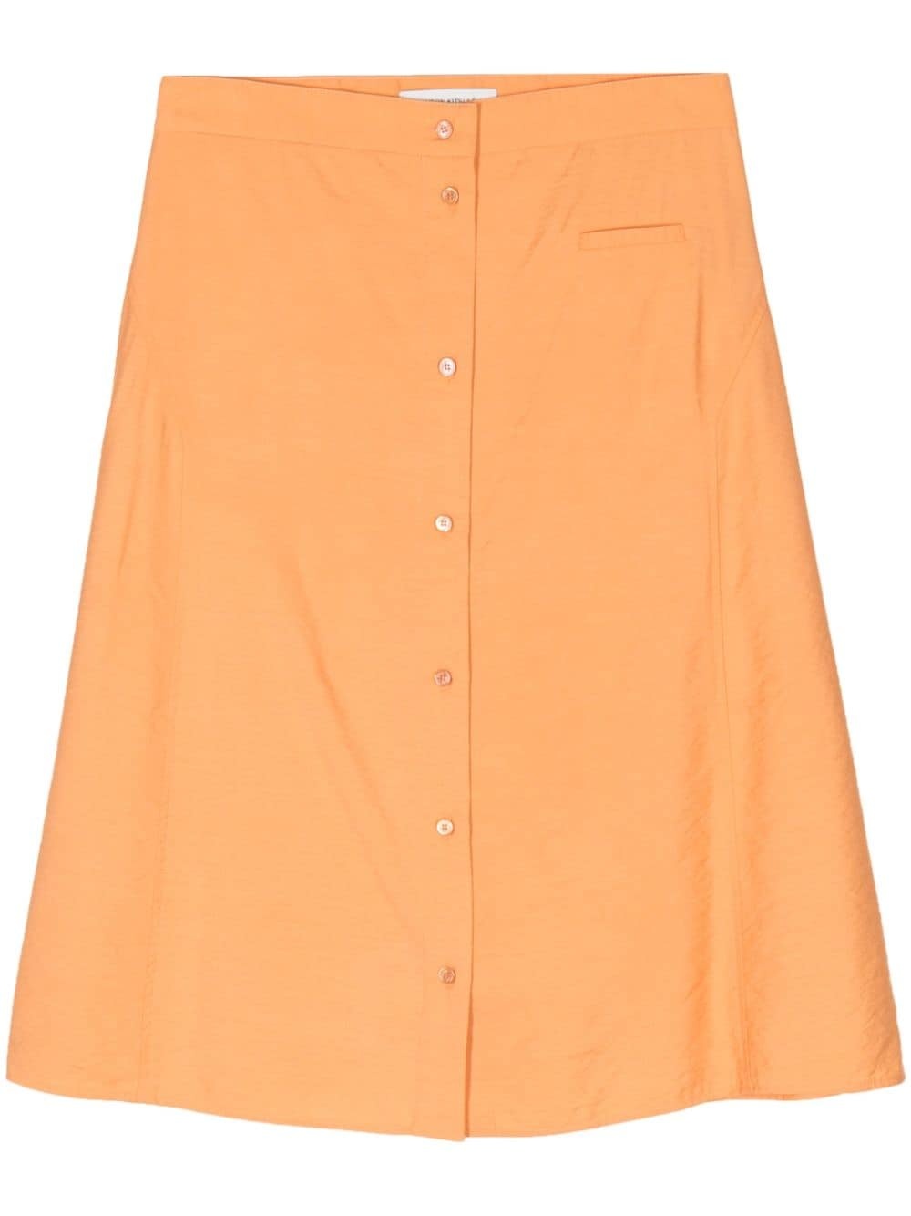 high-waisted A-line midi skirt Highlights - Sunset orange - Jersey texture - High-waisted - Front button fastening - Front welt pocket - A-line - Mid-length - Straight hem Imported Composition Body: Polyamide 89%, Cotton 11%