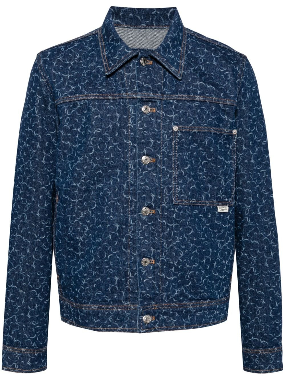 laser cut-detail denim jacket Highlights - Indigo blue - Cotton - Denim - Laser-cut detail - Contrast stitching - Applique logo - Mini logo tag - Pointed flat collar - Front button fastening - Long sleeves - Buttoned cuffs - Chest patch pocket - Straight hem Imported Composition Cotton 100% Washing instructions Machine Wash