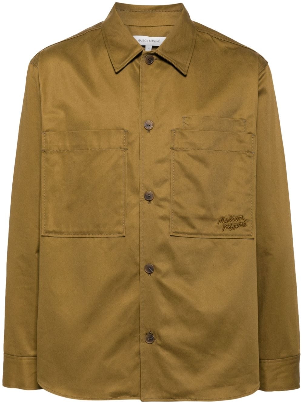logo-embroidered cotton shirt Highlights - Khaki - Cotton - Embroidered logo to the front - Classic collar - Front button fastening - Long sleeves - Buttoned cuffs - Chest patch pockets - Curved hem Imported Composition Cotton 100% SIZE & FIT Model measurements Height 6 ft 2 in(1.87 m) Bust/Chest 33.07 in(84 cm) Hips 35.43 in(90 cm) Waist 26.77 in(68 cm) FittingInformation Designed to be unstructured, offering a loose fit throughout Made from a midweight non-stretch fabric This piece fits true to size – take your usual size Washing instructions Dry Clean Only