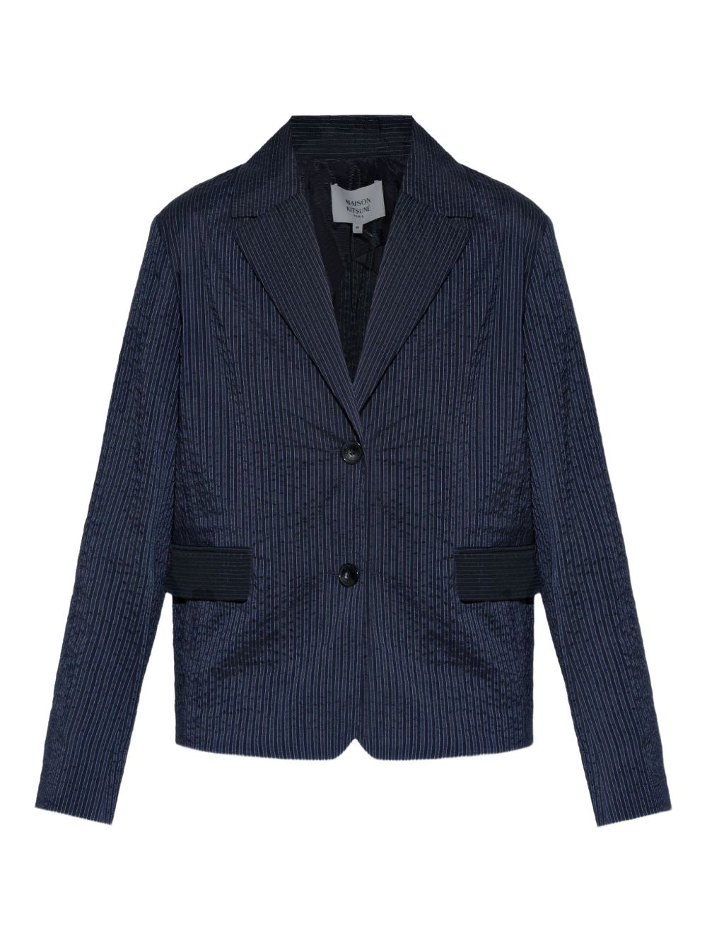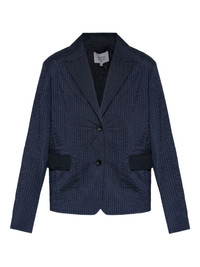 single-breasted jacket Highlights - Navy blue - Front button fastening - Front flap pockets - Stripe print - Buttoned cuffs Imported Composition Outer: Polyester 74%, Cotton 26% Lining: Viscose 51%, Cotton 49%