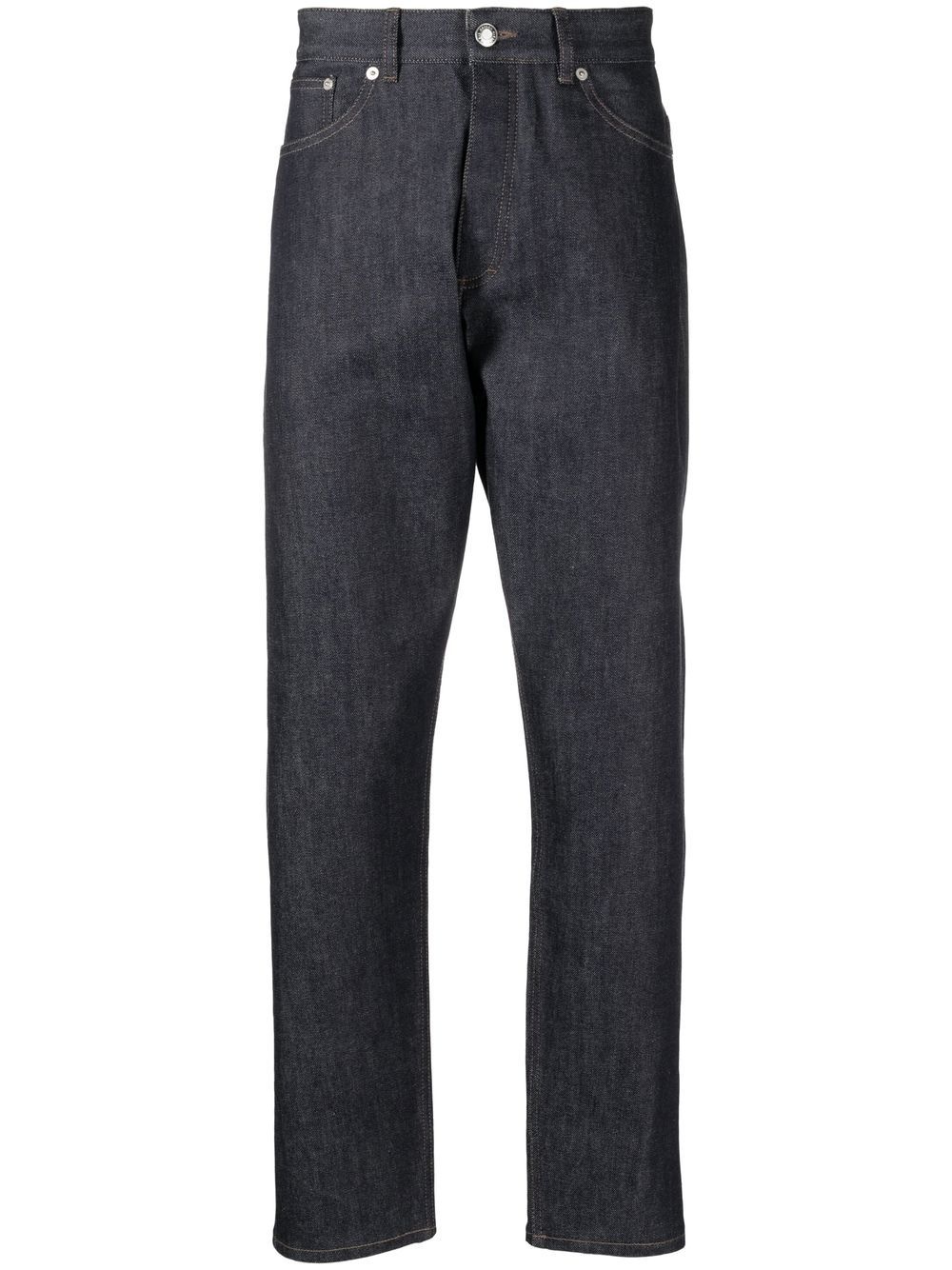 straight leg jeans midnight blue stretch-cotton belt loops high waist belt loops front button and zip fastening straight leg contrast stitching classic five pockets Imported Composition Body: Cotton 98%, Elastane 2% SIZE & FIT Model measurements Height 6 ft 2 in(1.87 m) Bust/Chest 34.25 in(87 cm) Hips 36.22 in(92 cm) Waist 29.52 in(75 cm) FittingInformation This piece fits true to size. We recommend you get your regular size Designed for a slim fit at the waist and loose over the leg Made with a mid-weight stretch fabric
