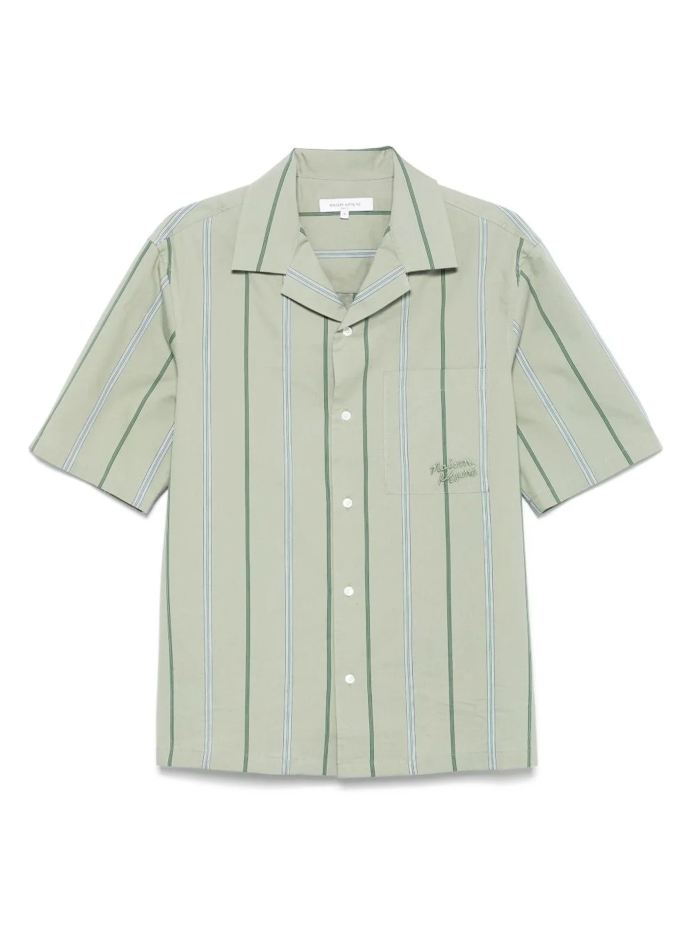 striped shirt Highlights - Sage green - Front button fastening - Chest patch pocket - Cuban collar - Straight hem Imported Composition Cotton 85%, Polyamide 15% SIZE & FIT Model measurements Height 6 ft 0 in(1.84 m) Bust/Chest 35.82 in(91 cm) Hips 37 in(94 cm) Waist 28.34 in(72 cm) FittingInformation Designed to be unstructured, offering a loose fit throughout Made from a midweight non-stretch fabric Washing instructions Dry Clean Only