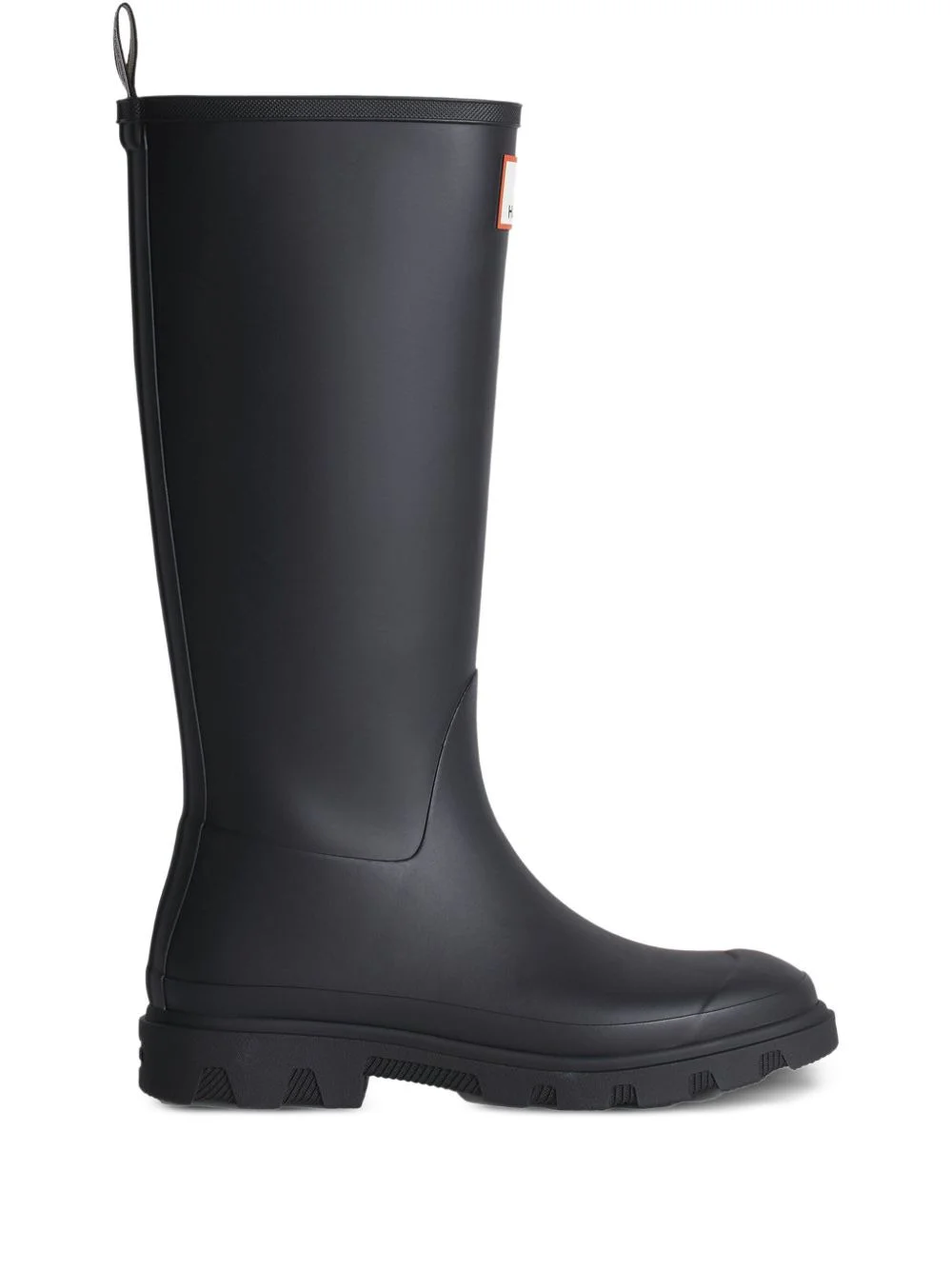 x Hunter Downpour tall rain boots Highlights - Black - Back pull-tab - Lug sole - Round toe - Logo patch Imported Composition Outer: Rubber 100% Lining: Rubber 100% Sole: Rubber 100%