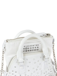5AC Cinema Inferno Baby cross body bag Highlights - Ivory white - Swarovski crystal embellishment - Rivet detailing - Signature numbers motif - Two rolled top handles - Detachable chain-link shoulder strap - Top zip fastening - Main compartment Made in Italy Composition Outer: glass 100%, Viscose 72%, Silk 28% Lining: Viscose 72%, Silk 28% SIZE & FIT Measurement STRAP 17.32 in(44 cm) DEPTH 2.36 in(6 cm) HANDLE 2.75 in(7 cm) WIDTH 5.11 in(13 cm) HEIGHT 5.11 in(13 cm)