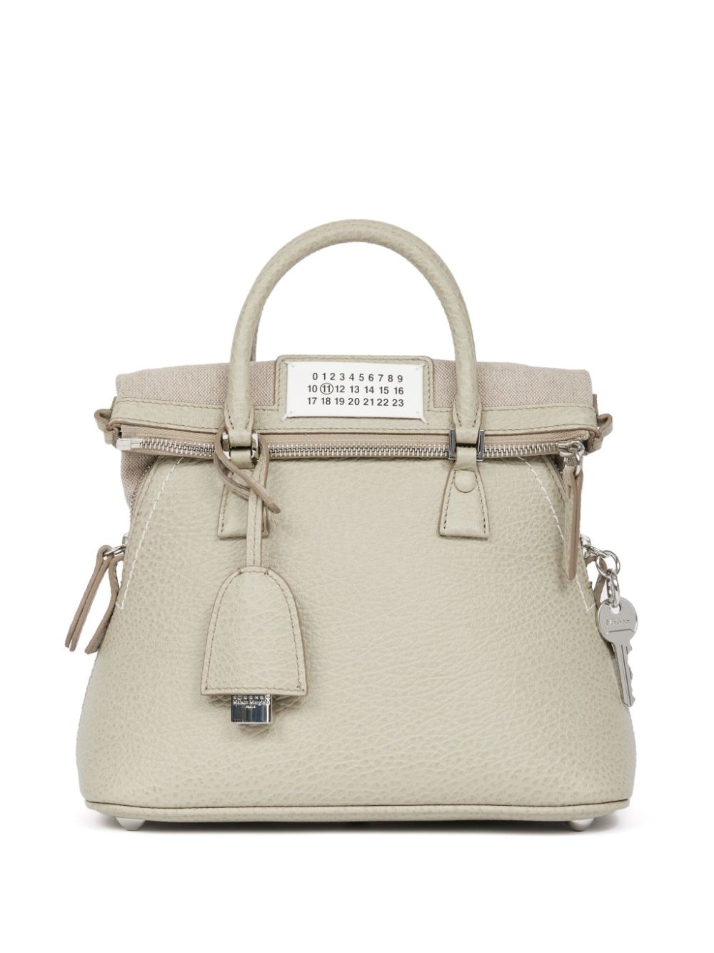 5AC Classique mini tote bag Highlights - Light beige - Calf leather - Pebbled texture - Logo charm - Number patch to the front - Key pendant - Foldover top - Zip fastening - Two rolled top handles Made in Italy Composition Lining: Polyester 100% Outer: Calf Leather 100% SIZE & FIT Measurement DEPTH 5.11 in(13 cm) HANDLE 8.26 in(21 cm) HEIGHT 7.08 in(18 cm) STRAP 17.32 in(44 cm) WIDTH 9.84 in(25 cm)