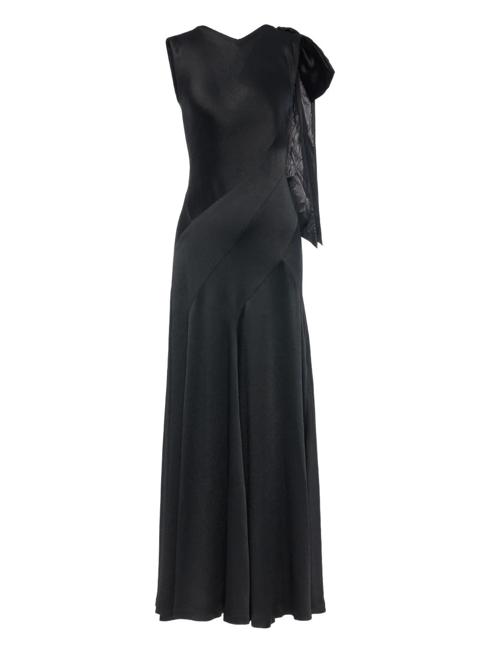 bow-detail asymmetric gown Highlights - Black - Bow detail - Sleeveless - V-neck - Panelled design - Long length Made in Italy Composition Viscose 52%, Acetate 48% Washing instructions Read Manufacturer Guidelines
