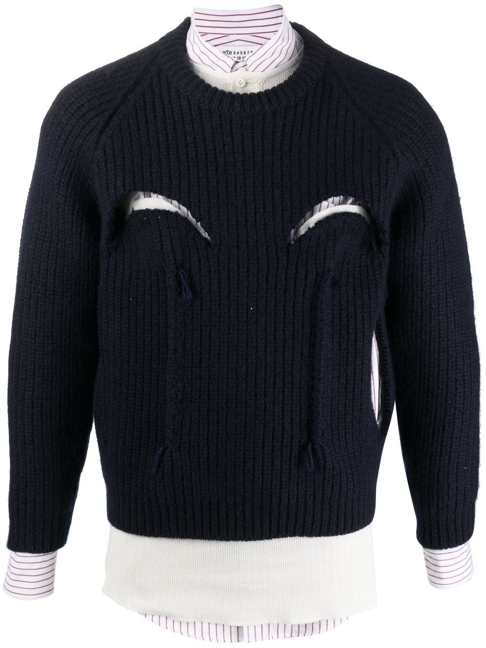 layered wool jumper Highlights - Chunky-knit cut-out jumper from maison margiela featuring navy blue, cotton, wool, chunky knit, crew neck, long sleeves and straight hem. Made in Italy Composition Cotton 100%, Wool 100% SIZE & FIT Model measurements Height 5 ft 11 in(1.8 m) Bust/Chest 33.07 in(84 cm) Hips 37.4 in(95 cm) Waist 25.19 in(64 cm) FittingInformation This piece fits small – you might want to get one size up Cut for a slim fit Made with a mid-weight fabric Measurement CHEST 42.51 in(108 cm) SLEEVE LENGTH 31.49 in(80 cm) WAIST 43.3 in(110 cm) Washing instructions Dry Clean Only
