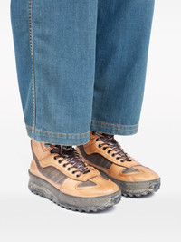 Climber high-top leather sneakers Infusing a trekking aesthetic into Maison Margiela's Replica style, the Climber sneakers showcase the characteristic paneled upper with a padded ankle and a high-top silhouette. They're crafted in Italy from supple leather, boasting a decorative logo tongue and the iconic single-stitch motif on the back. Highlights - Caramel brown - Smooth grain - Panelled design - Padded panels - Signature single-stitch logo - Padded ankle - Logo patch at the tongue - Front lace-up fastening - Round toe - Ridged rubber sole Made in Italy Composition Sole: Rubber 100% Outer: Calf Leather 100% Lining: Polyester 100%, Calf Leather 100%