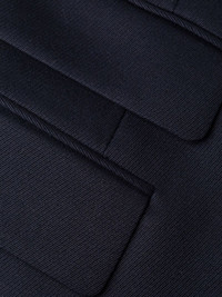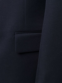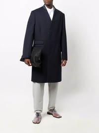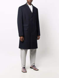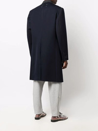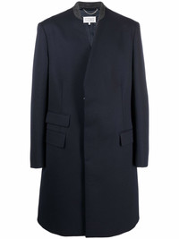 collarless mid-length coat navy blue wool signature four-stitch logo collarless concealed front button fastening front flap pockets long sleeves buttoned cuffs central rear vent Made in Italy Composition Lining: Cotton 100%, Viscose 100% Outer: Wool 100% SIZE & FIT Model measurements Height 6 ft 2 in(1.88 m) Bust/Chest 36.61 in(93 cm) Hips 35.82 in(91 cm) Waist 27.95 in(71 cm) FittingInformation This piece fits true to size. We recommend you get your regular size Cut for a loose fit Made with a mid-weight non-stretch fabric Washing instructions Dry Clean Only