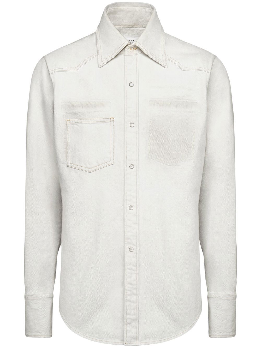 Selvedge denim shirt Crafted from cotton, this long-sleeve denim shirt from Maison Margiela is complete with a patch pocket to the chest. Highlights - Ice blue - Cotton - Classic collar - Front button fastening - Long sleeves - Curved hem - Chest patch pocket Made in Italy Composition Cotton 100% Washing instructions Read Manufacturer Guidelines