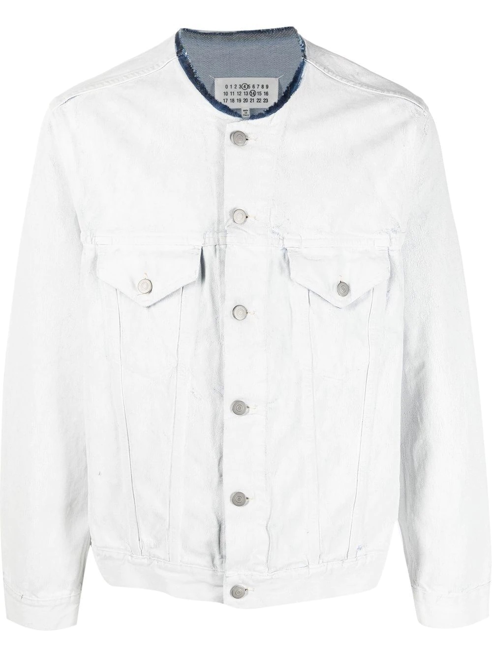 collarless denim jacket Highlights - White - Blue - Cotton - Cracked effect - Raw-cut edge - Contrasting collar - Round neck - Front button fastening - Two front flap pockets - Long sleeves - Buttoned cuffs - Straight hem - When buying this unisex item, keep in mind that it is graded in standard men's sizing. Made in Italy Composition Outer: Cotton 100% Lining: Polyester 65%, Cotton 35% SIZE & FIT Model measurements Height 5 ft 11 in(1.8 m) Bust/Chest 31.49 in(80 cm) Hips 35.82 in(91 cm) Waist 24.8 in(63 cm) FittingInformation This piece fits true to size. We recommend you get your regular size Cut for a loose fit Made with a mid-weight non-stretch fabric Washing instructions Hand Wash