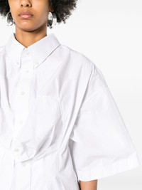 creased poplin fitted shirt Highlights - White - Cotton - Poplin texture - Crease effect - Button-down collar - Drop shoulder - Short sleeves - Chest patch pocket - Fitted waistline - Signature four-stitch logo - Rear box-pleat detail - Internal logo tag - Curved hem - Front button fastening Made in Italy Composition Cotton 100% SIZE & FIT Model measurements Height 5 ft 10 in(1.77 m) Bust/Chest 33.07 in(84 cm) Hips 37 in(94 cm) Waist 24.8 in(63 cm) FittingInformation Designed for a boxy fit, intended for a loose fit throughout Made from a midweight non-stretch fabric This piece fits true to size – take your usual size