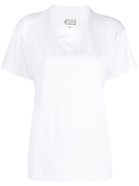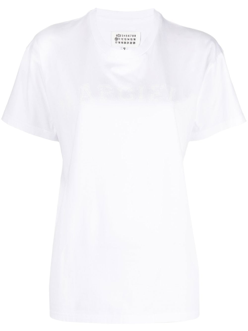 logo-print jersey T-shirt Cut from cotton, this Maison Margiela white T-shirt has a classic crew-neck silhouette for everyday wearing. Highlights - Crew-neck cotton t-shirt from maison margiela featuring white, cotton, crew neck, short sleeves and straight hem. Made in Italy Composition Cotton 100% SIZE & FIT Model measurements Height 5 ft 10 in(1.79 m) Bust/Chest 31.49 in(80 cm) Hips 35.03 in(89 cm) Waist 23.62 in(60 cm) FittingInformation This piece fits true to size. We recommend you get your regular size Cut for a relaxed fit Made with a mid-weight fabric Washing instructions Machine Wash