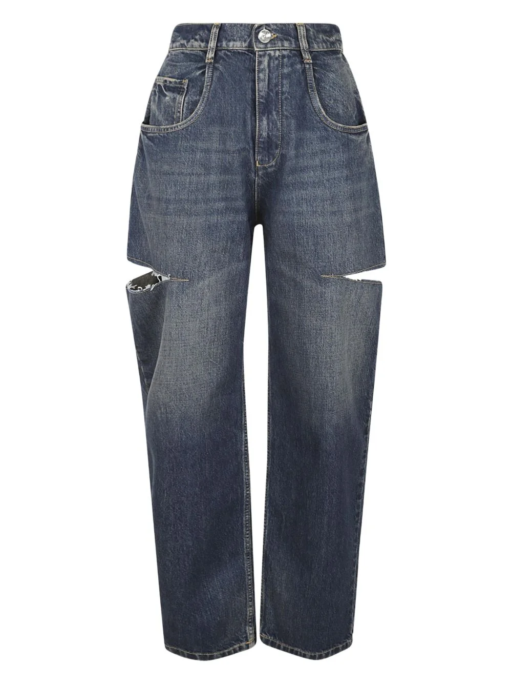 cut-out jeans Highlights - Washed indigo blue - Five pockets - Cut-out detail - Frayed edge - Belt loops - Button and zip fastening Made in Italy Composition Fabric 100% Washing instructions Read Manufacturer Guidelines