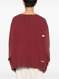 distressed layered cotton sweatshirt Showcasing the brand's affinity for distressed designs, the key use of contrast stitching makes this an instantly recognisable Maison Margiela piece. Featuring the iconic four-stitch logo at the back, the brand's 'contradicting of the norm' is reiterated, as it is meant to remain visible and not be unpicked. Highlights - Bordeaux red - Cotton - Jersey texture - Distressed finish - Layered design - Ribbed crew neck - Drop shoulder - Long sleeves - Signature four-stitch logo to the rear - Ribbed cuffs and hem Made in Italy Composition Cotton 100% SIZE & FIT Model measurements Height 6 ft 2 in(1.87 m) Bust/Chest 33.46 in(85 cm) Hips 36.22 in(92 cm) Waist 29.52 in(75 cm) FittingInformation Designed for an oversized fit, offering additional room throughout Made from a midweight non-stretch fabric, this piece offers minimal elasticity when worn This piece fits true to size – take your usual size