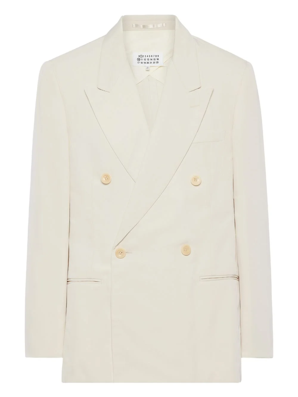 double-breasted blazer Highlights - Off-white - Double-breasted - Button fastening - Peak lapels - Welt pockets - Long sleeves Made in Italy Composition Polyamide 61%, Viscose 39% Washing instructions Read Manufacturer Guidelines