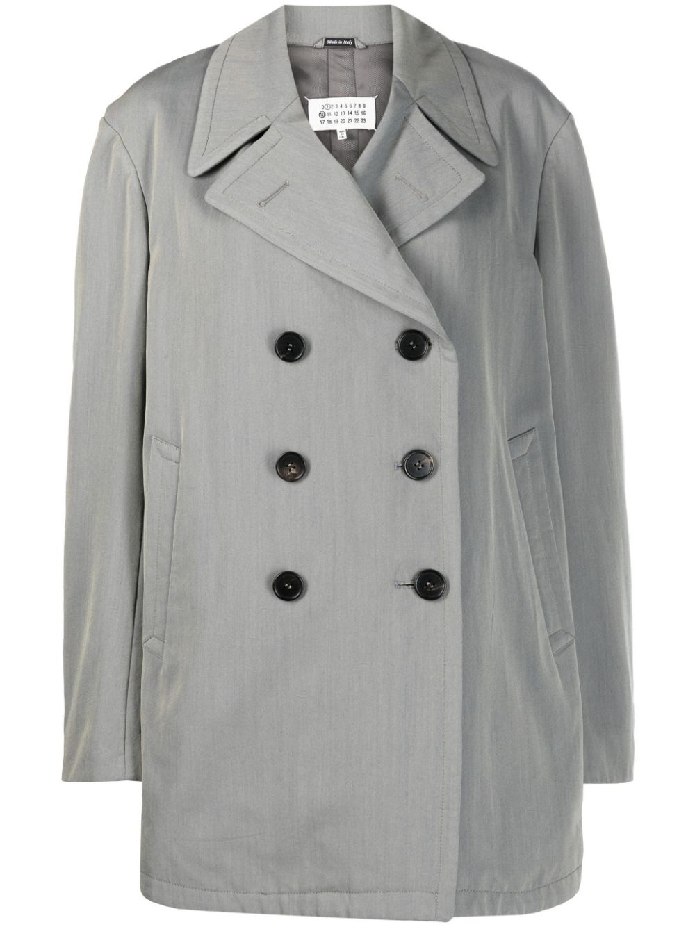 double-breasted jacket Maison Margiela's signature four-stitch logo is evocative of the brand's use of minimal details. The trademark stitches detail the back of this double-breasted wool blend coat. Made in Italy Composition Outer: Cotton 52%, Wool 46% Lining: Viscose 100%, Polyester 100%, Cotton 100% SIZE & FIT Model measurements Height 5 ft 11 in(1.8 m) Bust/Chest 33.07 in(84 cm) Hips 37.4 in(95 cm) Waist 25.19 in(64 cm) FittingInformation This piece fits true to size. We recommend you get your regular size Cut for a loose fit Made with a mid-weight non-stretch fabric Washing instructions Dry Clean Only