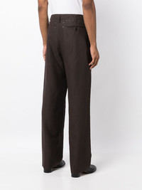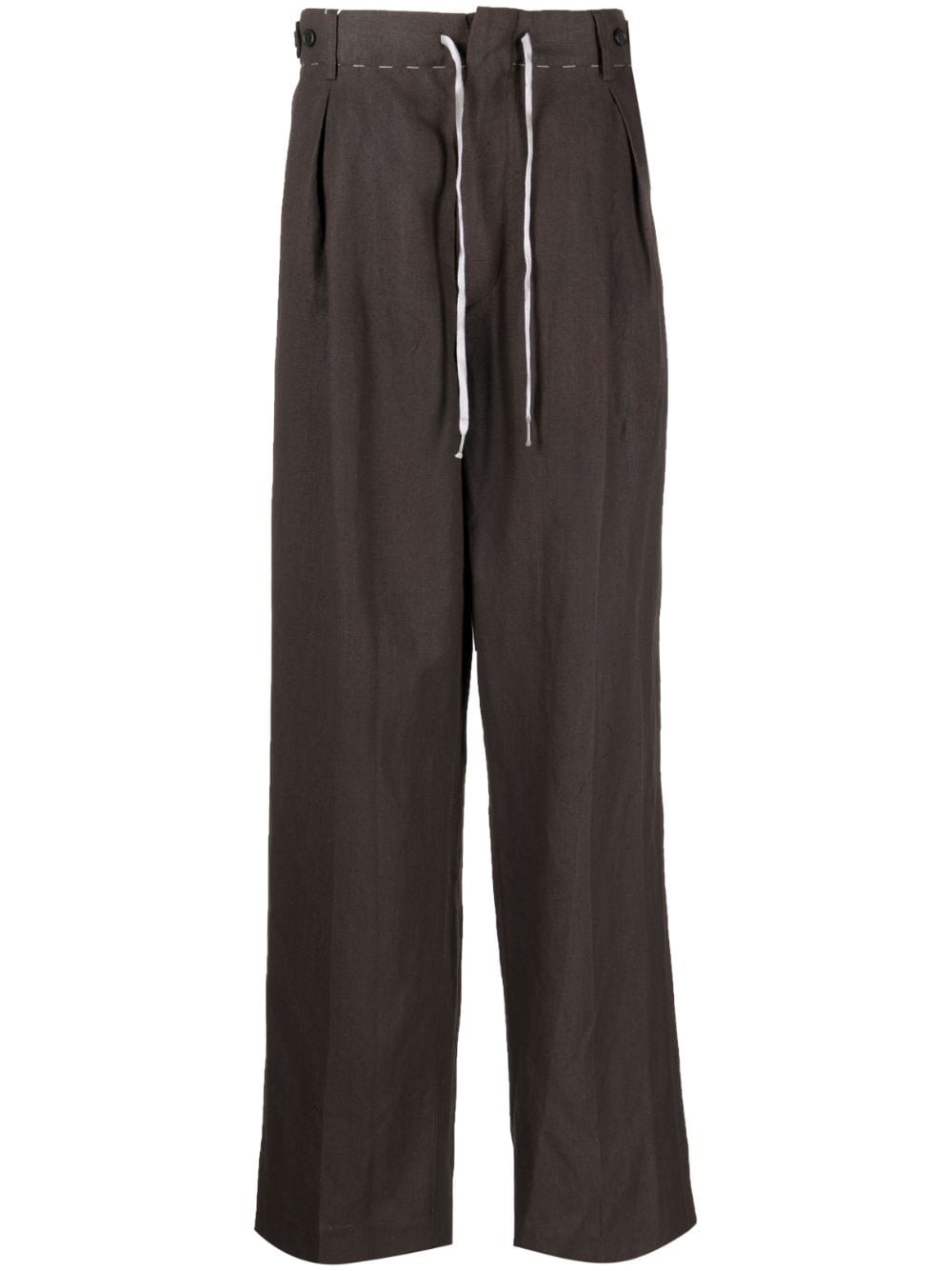 drawstring straight-leg trousers Highlights - Chocolate brown - Linen/flax-wool blend - Drawstring fastening waist - Straight leg - Two side slit pockets - Two rear welt pockets Made in Italy Composition Wool 55%, Linen/Flax 45% SIZE & FIT Model measurements Height 6 ft 3 in(1.9 m) Bust/Chest 35.03 in(89 cm) Hips 36.61 in(93 cm) Waist 29.13 in(74 cm) FittingInformation Designed for a straight-leg, allowing for an unrestricted and comfortable fit over the leg Made from a midweight non-stretch fabric This piece fits true to size – take your usual size