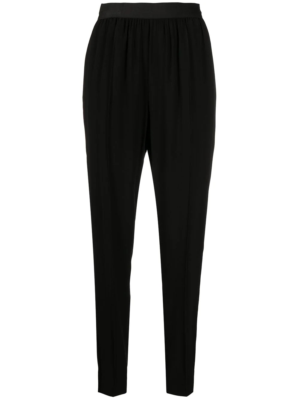 elasticated waistband tapered trousers Comfort comes first, right? But it's always a nice suprise when it's doubled up with style, like this pair of stretch-fit tapered trousers by Maison Margiela. Win, win. Made in Italy Composition Outer: Viscose 100% Lining: Viscose 100% SIZE & FIT Model measurements Height 5 ft 10 in(1.79 m) Bust/Chest 31.88 in(81 cm) Hips 35.43 in(90 cm) Waist 23.62 in(60 cm) FittingInformation This piece fits true to size. We recommend you get your regular size Cut for a slim fit Made with a mid-weight non-stretch fabric Measurement FRONT RISE 12.59 in(32 cm) INSIDE LEG 29.92 in(76 cm) Hem Width 5.11 in(13 cm) HIPS 33.85 in(86 cm) WAIST 24.4 in(62 cm)
