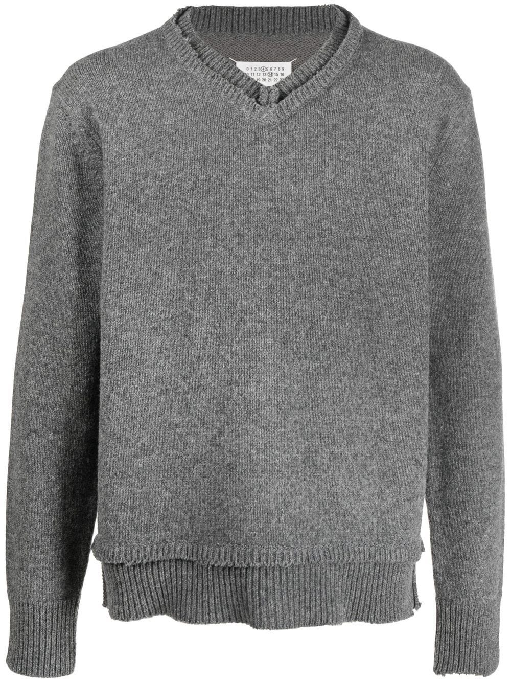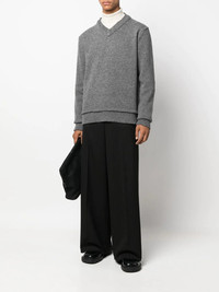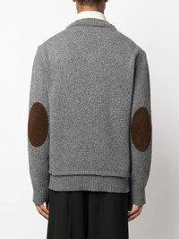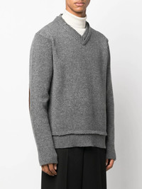 elbow-patch knitted jumper Highlights - Charcoal grey - Linen-wool blend - Knitted construction - Elbow patches - Ribbed edge - V-neck - Long sleeves - Straight hem Made in Italy Composition Wool 46%, Linen/Flax 31%, Cotton 23% SIZE & FIT Model measurements Height 6 ft 2 in(1.87 m) Bust/Chest 38.18 in(97 cm) Hips 36.61 in(93 cm) Waist 29.13 in(74 cm) Measurement CHEST 41.73 in(106 cm) SLEEVE LENGTH 25.19 in(64 cm) LENGTH 25.98 in(66 cm) Washing instructions Hand Wash