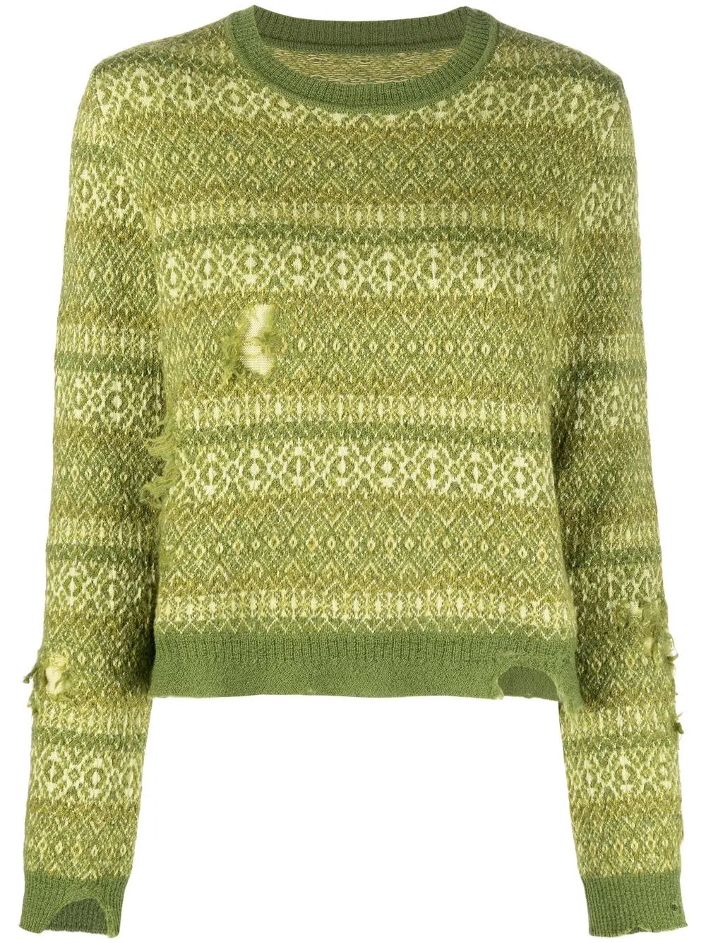 Fair Isle distressed-finish jumper Maison Margiela isn't afraid to stray away from clean and pristine looks, and this Faire Isle jumper is proof, with its distinctive distressed finish. Imported Composition Wool 100% SIZE & FIT Model measurements Height 5 ft 11 in(1.8 m) Bust/Chest 31.49 in(80 cm) Hips 36.61 in(93 cm) Waist 24.4 in(62 cm) Measurement BUST 36.22 in(92 cm) FittingInformation This piece fits true to size. We recommend you get your regular size Cut for a loose fit Made with a mid-weight fabric Washing instructions Dry Clean Only