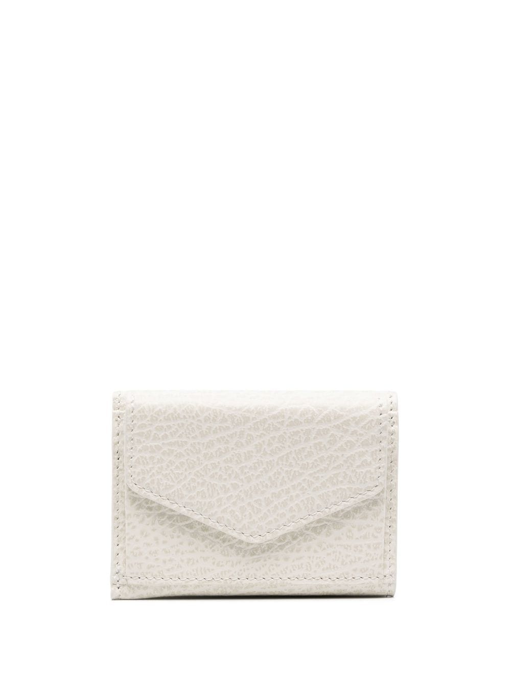 four-stitch leather bi-fold wallet Highlights - Greige - Calf leather - Signature four-stitch logo - Tri-fold design - Concealed press-stud fastening - Rear flap pocket - Internal slip pocket - Internal logo stamp Made in Italy Composition Outer: Calf Leather 100% Lining: Viscose 100% SIZE & FIT Measurement HEIGHT 2.75 in(7 cm) WIDTH 3.74 in(9.5 cm)