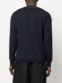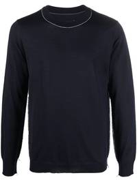 Work-In-Progress wool jumper Highlights - Four-stitch crew neck jumper from maison margiela featuring navy blue, cotton-wool blend, contrast stitching, crew neck, long sleeves and ribbed cuffs. Made in Italy Composition Wool 98%, Cotton 2% SIZE & FIT Model measurements Height 5 ft 9 in(1.74 m) Bust/Chest 32.28 in(82 cm) Hips 35.82 in(91 cm) Waist 24.01 in(61 cm) Measurement CHEST 39.37 in(100 cm) SLEEVE LENGTH 25.98 in(66 cm) Shoulder Width 14.96 in(38 cm) FittingInformation This piece fits true to size. We recommend you get your regular size Cut for a relaxed fit Made with a mid-weight fabric
