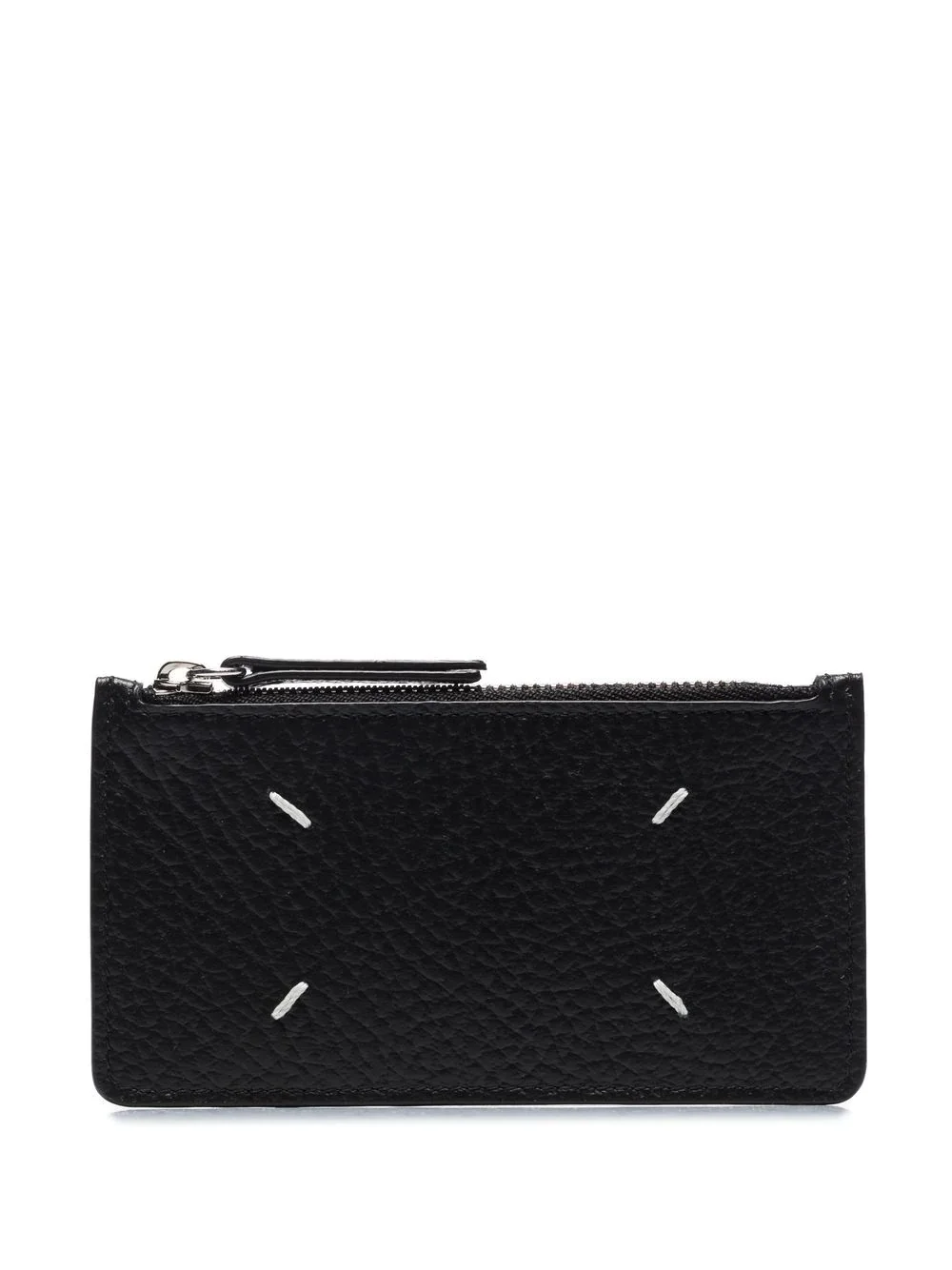 four-stitch leather card holder Crafted in Italy from soft leather, this black cardholder from Maison Margiela is adorned with the house's signature four-stitch motif at the front for a recognizable yet minimalistic look. Finished with refined silver-tone hardware, it benefits from external card slots and a zipped pocket. Highlights - Black - Calf leather - Signature four-stitch logo - Card slots - Coin pocket - Silver-tone hardware Made in Italy Composition Outer: Calf Leather 100%, Brass 100%, Zinc 94%, Aluminium 4%, Copper 2% Lining: Calf Leather 100%, Viscose 100% SIZE & FIT Measurement LENGTH 2.75 in(7 cm) WIDTH 5.11 in(13 cm)