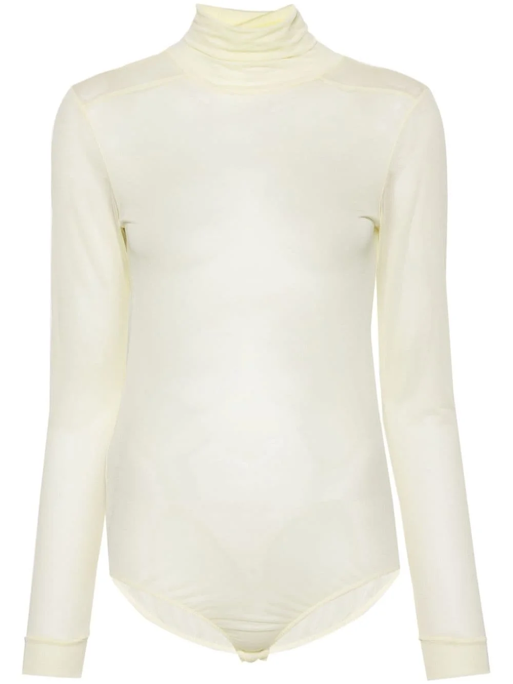 four-stitch sheer bodysuit Highlights - Light yellow - Stretch-jersey - Semi-sheer construction - Roll neck - Long sleeves - Fitted-cuff sleeves - Signature four-stitch logo - Press-stud fastening - Just a reminder that this piece must be tried on over your own garments. Made in Italy Composition Viscose 100% SIZE & FIT Model measurements Height 5 ft 11 in(1.8 m) Bust/Chest 31.49 in(80 cm) Hips 36.61 in(93 cm) Waist 24.4 in(62 cm) Measurement BUST 25.19 in(64 cm) LENGTH 27.55 in(70 cm) WAIST 28.34 in(72 cm) SLEEVE LENGTH 24.8 in(63 cm) FittingInformation Designed for a slim fit that sits just away from the body offering a close yet comfortable fit Made from a lightweight stretch fabric, this piece offers elasticity and flexibility when worn This piece fits true to size – take your usual size Washing instructions Dry Clean Only