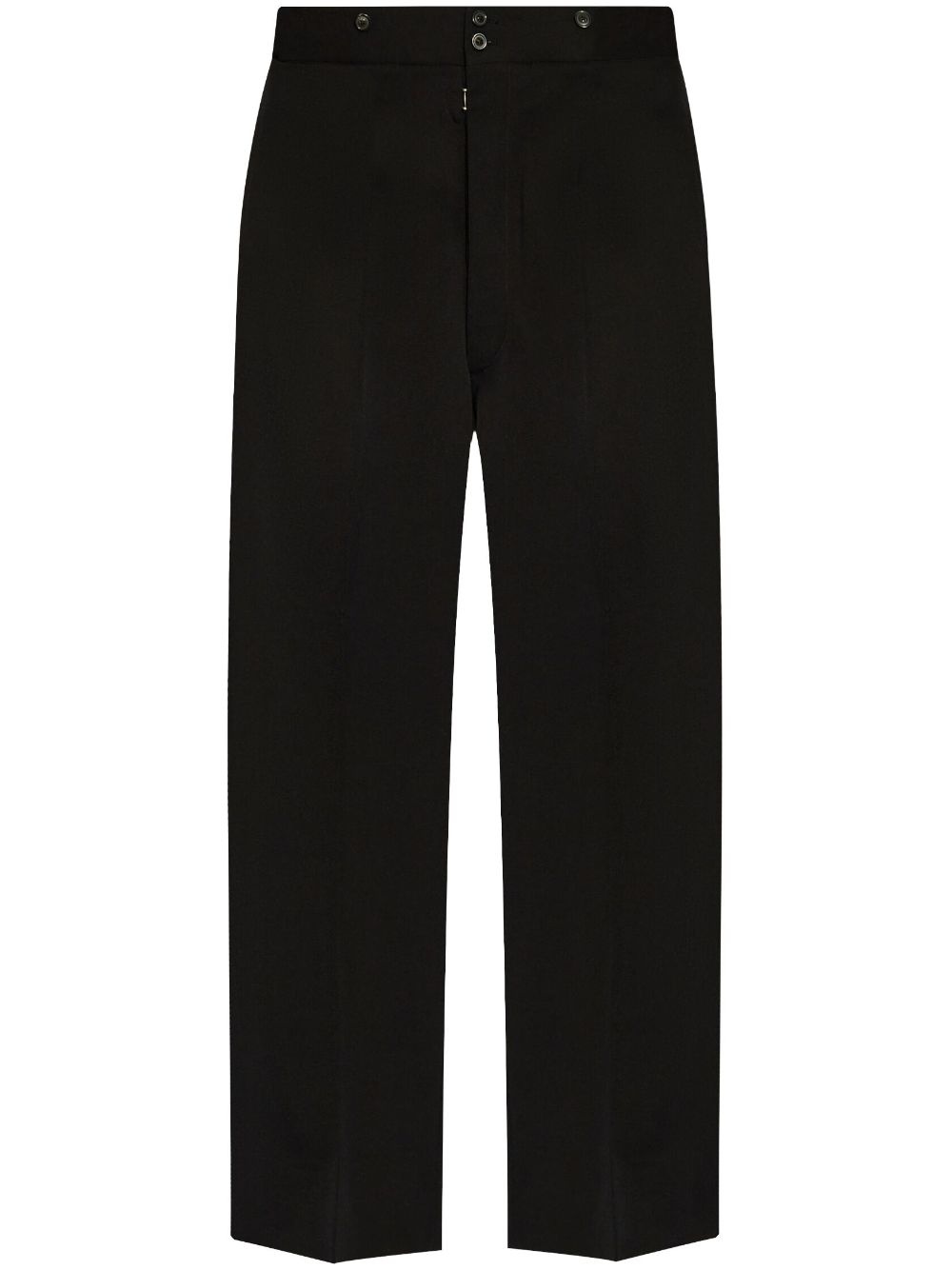 four-stitch wool trousers Highlights - Black - Wool - Tailored design - Signature four-stitch logo - Pressed crease - High-waisted - Concealed fly and button fastening - Belt loops - Wide leg - Two side slit pockets - Rear button-fastening jetted pocket Made in Italy Composition Wool 100% Washing instructions Read Manufacturer Guidelines