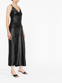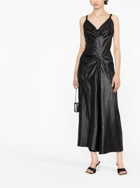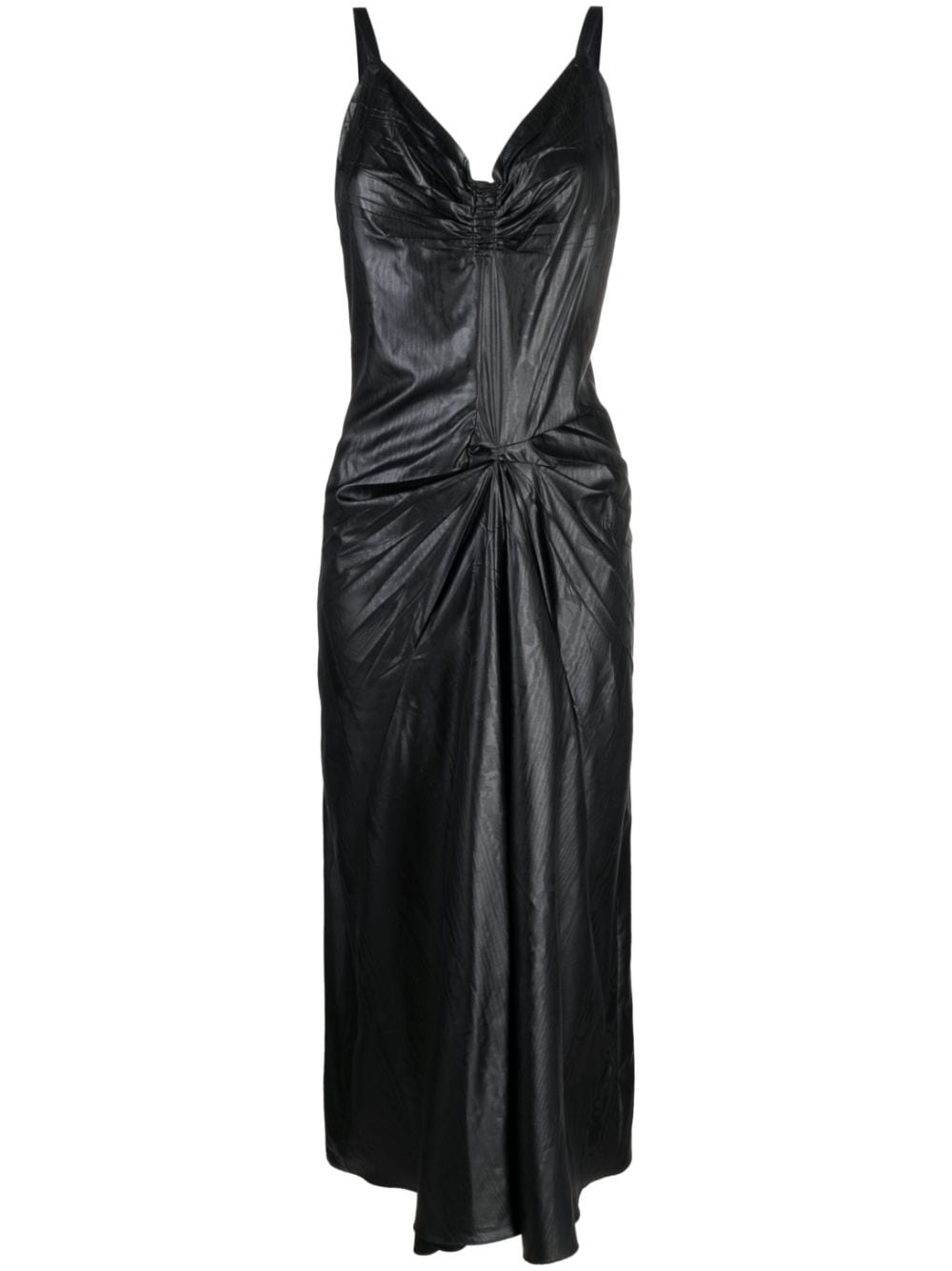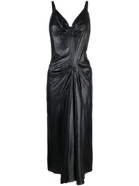 moire-effect midi dress Echoing the brand’s avant-garde aesthetic, this black dress from Maison Margiela is enhanced with gathered detailing that creates an asymmetric look. Highlights - Black - Satin finish - Ruched detailing - Gathered detailing - V-neck - Rear zip fastening - Thin shoulder straps - Mid-length Made in Italy Composition Polyester 100% SIZE & FIT Model measurements Height 5 ft 10 in(1.78 m) Bust/Chest 30.7 in(78 cm) Hips 34.64 in(88 cm) Waist 23.22 in(59 cm) FittingInformation Designed for a close fit at the chest with a loose fit over the waist and hips Made from a lightweight non-stretch fabric This piece fits true to size – take your usual size Washing instructions Hand Wash