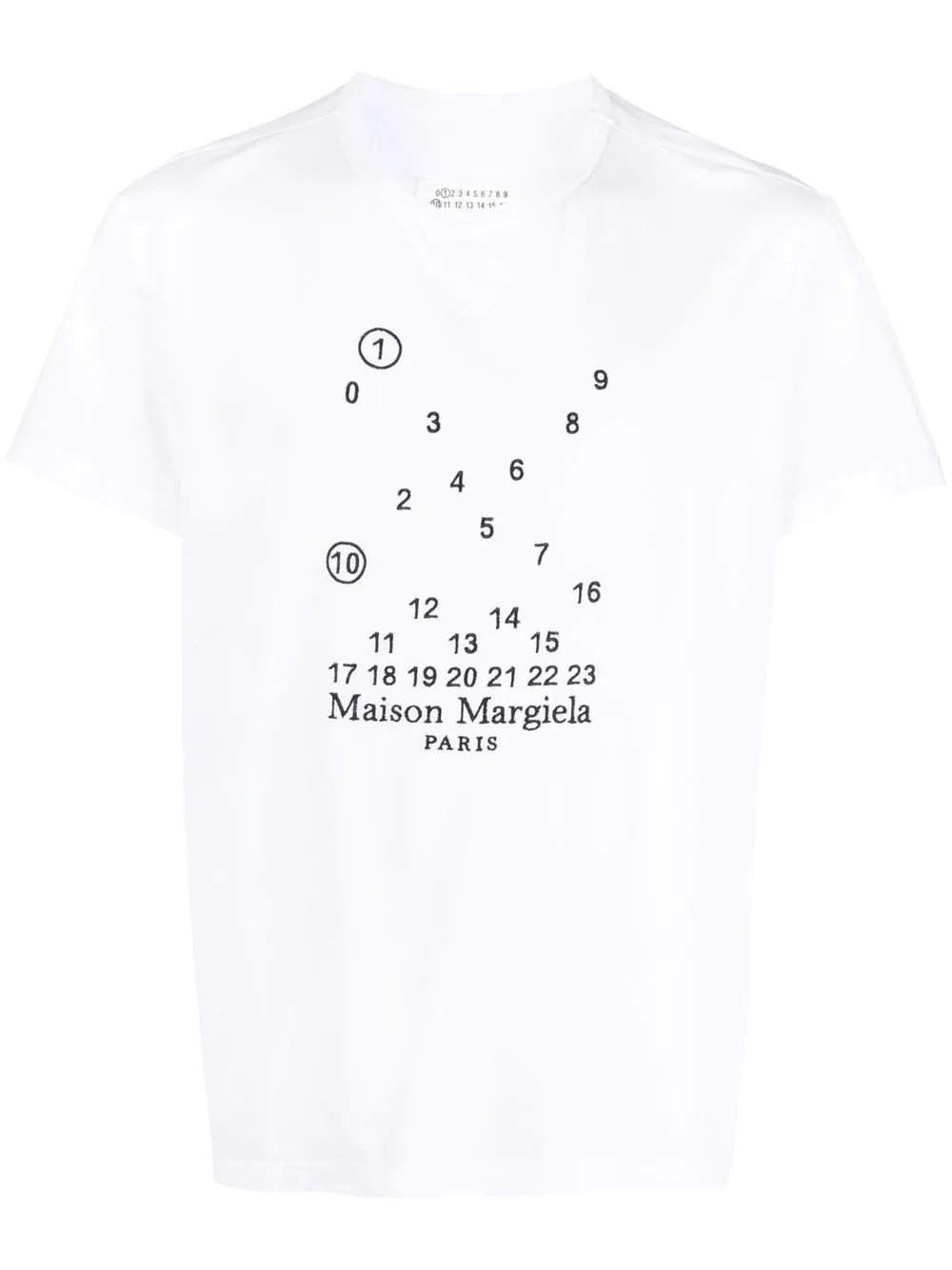 Numeric logo-embroidered T-shirt Tying in with contemporary branding trends, this short-sleeve T-shirt form Maison Margiela features the signature numbers logo across the front. In a contrasting colourway, this element stands out even more. Highlights - White - Cotton - Graphic print to the front - Round neck - Short sleeves Made in Italy Composition Cotton 100% SIZE & FIT Model measurements Height 5 ft 11 in(1.81 m) Bust/Chest 36.61 in(93 cm) Hips 37.4 in(95 cm) Waist 24.8 in(63 cm) Measurement CHEST 41.73 in(106 cm) FittingInformation This piece fits true to size. We recommend you get your regular size Cut for a relaxed fit Made with a mid-weight fabric Washing instructions Machine Wash