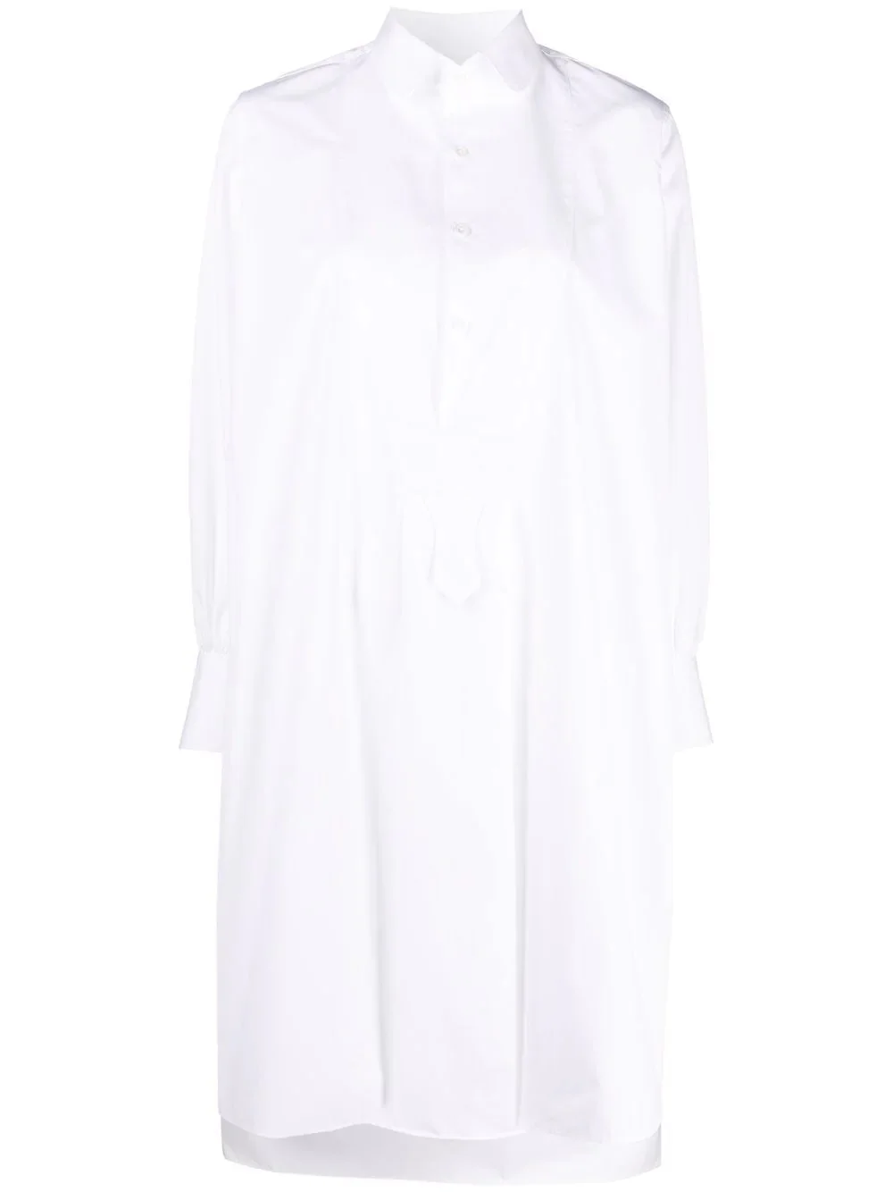 high-low hem shirtdress Crafted from soft cotton and designed with a high-low hem, this white shirtdress from Maison Margiela is topped with a charming rounded collar and finished with the brand's signature four-stitch logo to the rear. Made in Italy Composition Cotton 100% SIZE & FIT Model measurements Height 5 ft 10 in(1.78 m) Bust/Chest 33.07 in(84 cm) Hips 36.61 in(93 cm) Waist 24.8 in(63 cm) FittingInformation This piece fits true to size. We recommend you get your regular size Cut for a loose fit Made with a mid-weight non-stretch fabric Washing instructions Machine Wash