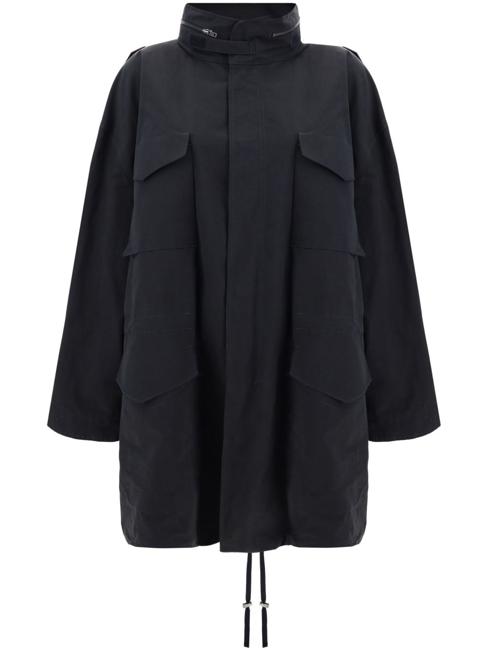 hooded coat Highlights - Black - Cotton blend - Front press-stud and zip fastening - Stand-up collar - Concealed hood - Epaulettes - Drop shoulder - Long sleeves - Press-stud fastening cuffs - Two chest flap pockets - Two front flap pockets - Signature four-stitch logo - Full lining - Drawstring hem - Mid-length Made in Italy Composition Lining: Cotton 100% Outer: Cotton 65%, Polyamide 35% SIZE & FIT FittingInformation Designed for an oversized fit, offering additional room throughout The adjustable drawstring means that you can adjust this piece’s fit to suit your comfort and preference Made from a midweight non-stretch fabric This piece fits very large – take two sizes down