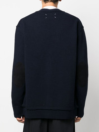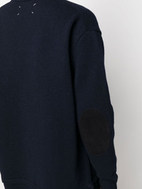 elbow-patch V-neck cardigan Maison Margiela showcases the brand's minimalist aesthetic on this V-neck cardigan. Featuring the iconic four-stitch logo at the back, the brand's 'contradicting of the norm' is reitierated as it is meant to remain visible and not be unpicked. Highlights - Navy blue - Wool-linen-cotton blend - Knitted construction - Ribbed edge - Drop shoulder - V-neck - Front button fastening - Long sleeves - Straight hem - When buying this unisex item, keep in mind that it is graded in standard men's sizing. Made in Italy Composition Calf Leather 100%, Wool 46%, Linen/Flax 31%, Cotton 23% SIZE & FIT Model measurements Height 5 ft 10 in(1.78 m) Bust/Chest 33.07 in(84 cm) Hips 36.61 in(93 cm) Waist 24.8 in(63 cm) Measurement CHEST 44.88 in(114 cm) LENGTH 28.34 in(72 cm) SLEEVE LENGTH 25.19 in(64 cm) Washing instructions Hand Wash