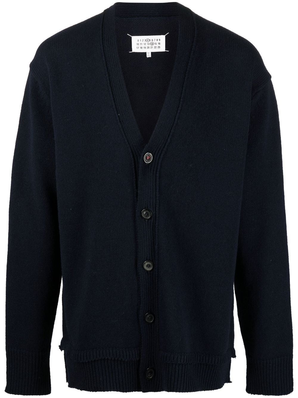 elbow-patch V-neck cardigan Maison Margiela showcases the brand's minimalist aesthetic on this V-neck cardigan. Featuring the iconic four-stitch logo at the back, the brand's 'contradicting of the norm' is reitierated as it is meant to remain visible and not be unpicked. Highlights - Navy blue - Wool-linen-cotton blend - Knitted construction - Ribbed edge - Drop shoulder - V-neck - Front button fastening - Long sleeves - Straight hem - When buying this unisex item, keep in mind that it is graded in standard men's sizing. Made in Italy Composition Calf Leather 100%, Wool 46%, Linen/Flax 31%, Cotton 23% SIZE & FIT Model measurements Height 5 ft 10 in(1.78 m) Bust/Chest 33.07 in(84 cm) Hips 36.61 in(93 cm) Waist 24.8 in(63 cm) Measurement CHEST 44.88 in(114 cm) LENGTH 28.34 in(72 cm) SLEEVE LENGTH 25.19 in(64 cm) Washing instructions Hand Wash