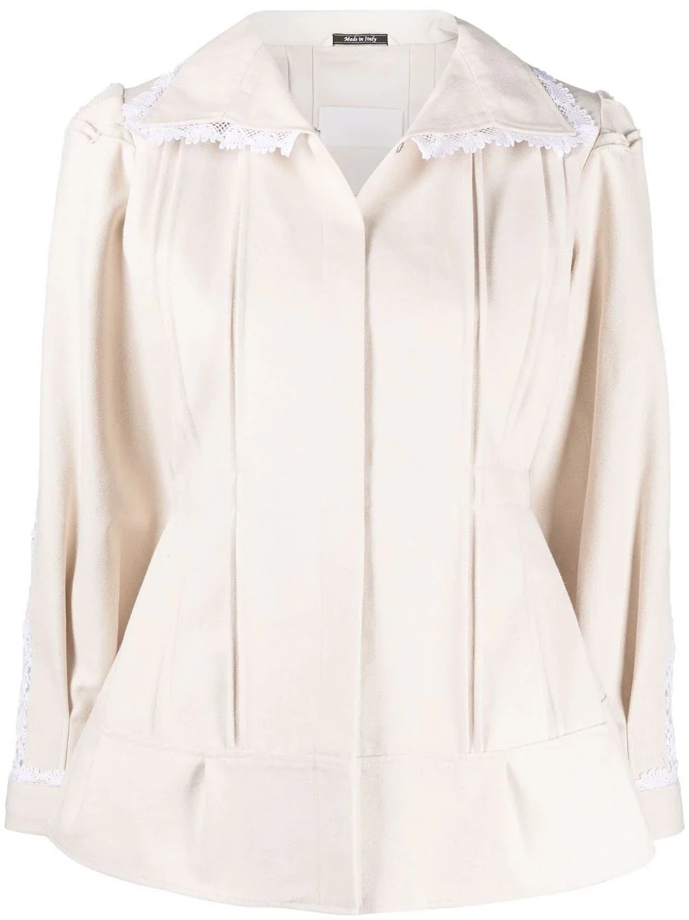 lace-trim pleat-detail fitted jacket Italian-made, Maison Margiela's lace-trim fitted jacket is crafted from ecru cotton. Forming part of the brand's SS22 collection, it features pleat detailing and a fitted waistband. Made in Italy Composition Cotton 100% Washing instructions Dry Clean Only