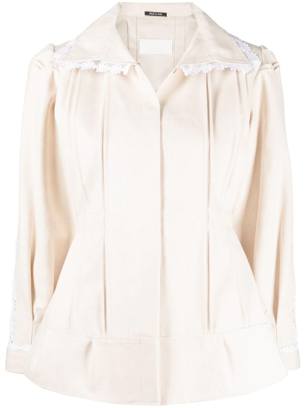 lace-trim pleat-detail fitted jacket Italian-made, Maison Margiela's lace-trim fitted jacket is crafted from ecru cotton. Forming part of the brand's SS22 collection, it features pleat detailing and a fitted waistband. Made in Italy Composition Cotton 100% SIZE & FIT Model measurements Height 5 ft 11 in(1.8 m) Bust/Chest 31.49 in(80 cm) Hips 35.82 in(91 cm) Waist 24.8 in(63 cm) FittingInformation This piece fits true to size. We recommend you get your regular size Cut for a loose fit Made with a mid-weight non-stretch fabric Washing instructions Dry Clean Only