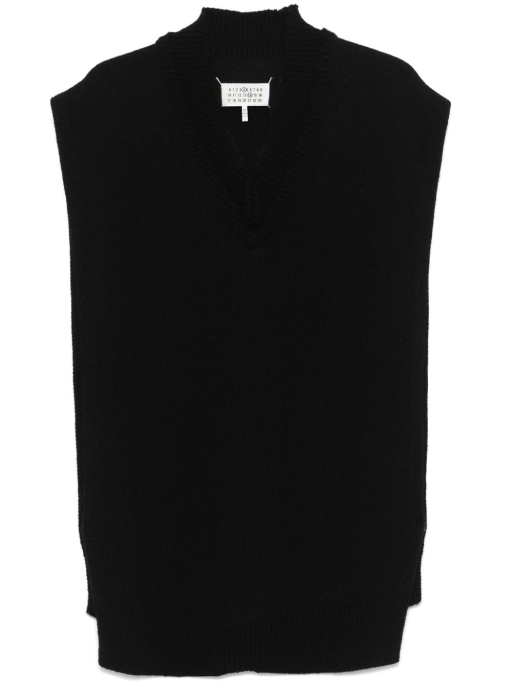 layered knitted vest Highlights - Black - Fine knit - Layered details - Side button fastening - V-neck - Sleeveless - Ribbed hem Made in Italy Composition Wool 46%, Linen/Flax 31%, Cotton 23% SIZE & FIT Model measurements Height 6 ft 2 in(1.88 m) Bust/Chest 36.61 in(93 cm) Hips 35.82 in(91 cm) Waist 27.95 in(71 cm) FittingInformation Designed to be unstructured, offering a loose fit throughout Made with a midweight knit, this piece offers some stretch