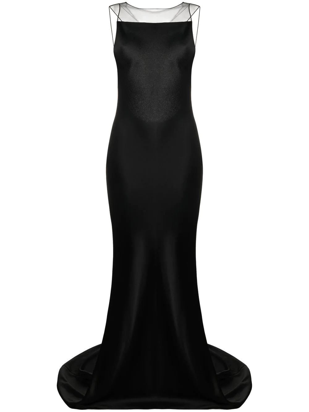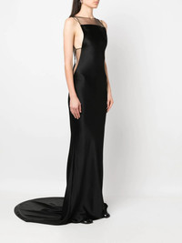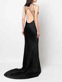 satin fishtail gown Highlights - Jet black - Mesh detailing - Satin finish - Square neck - Spaghetti straps - Backless - Fishtail train - Long length Made in Italy Composition Polyamide 100%, Viscose 52%, Acetate 48% SIZE & FIT Model measurements Height 5 ft 10 in(1.78 m) Bust/Chest 31.49 in(80 cm) Hips 36.22 in(92 cm) Waist 25.59 in(65 cm) Measurement WAIST 28.34 in(72 cm) HIPS 33.07 in(84 cm) Washing instructions Dry Clean Only