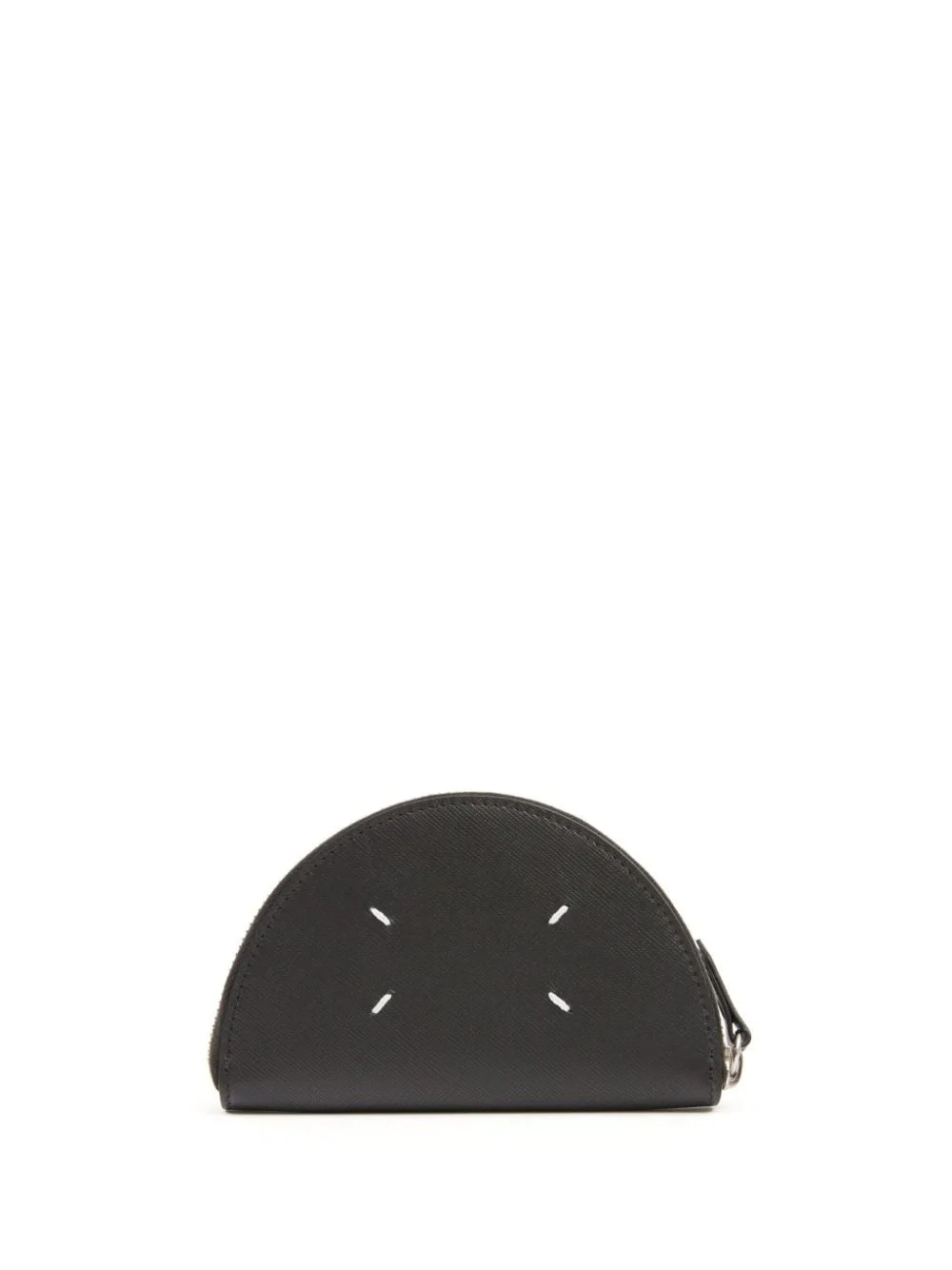 micro Halfmoon leather clutch Highlights - Black - Calf leather - Saffiano leather - Signature four-stitch logo - Top zip fastening - Main compartment - Internal logo stamp - Internal flap pocket Made in Italy Composition Calf Leather 100% SIZE & FIT Measurement DEPTH 0.78 in(2 cm) LENGTH 8.85 in(22.5 cm) WIDTH 4.72 in(12 cm)